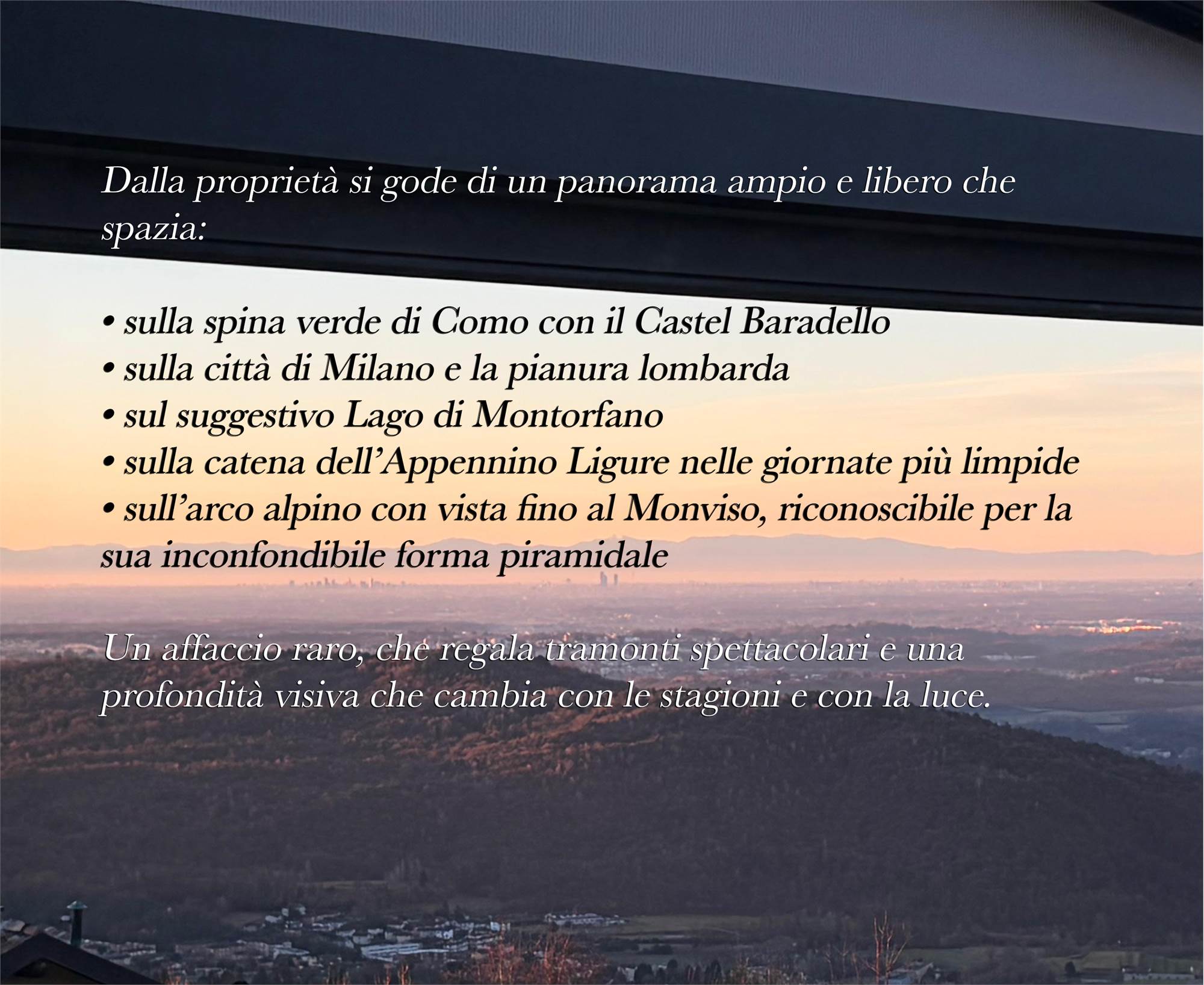 In una delle zone collinari più affascinanti e tranquille del comasco, proponiamo in vendita un delizioso appartamento all’ultimo piano (senza ascensore), con affacci su tre lati e avvolto da una splendida vista panoramica che dona luce naturale per tutto il giorno.